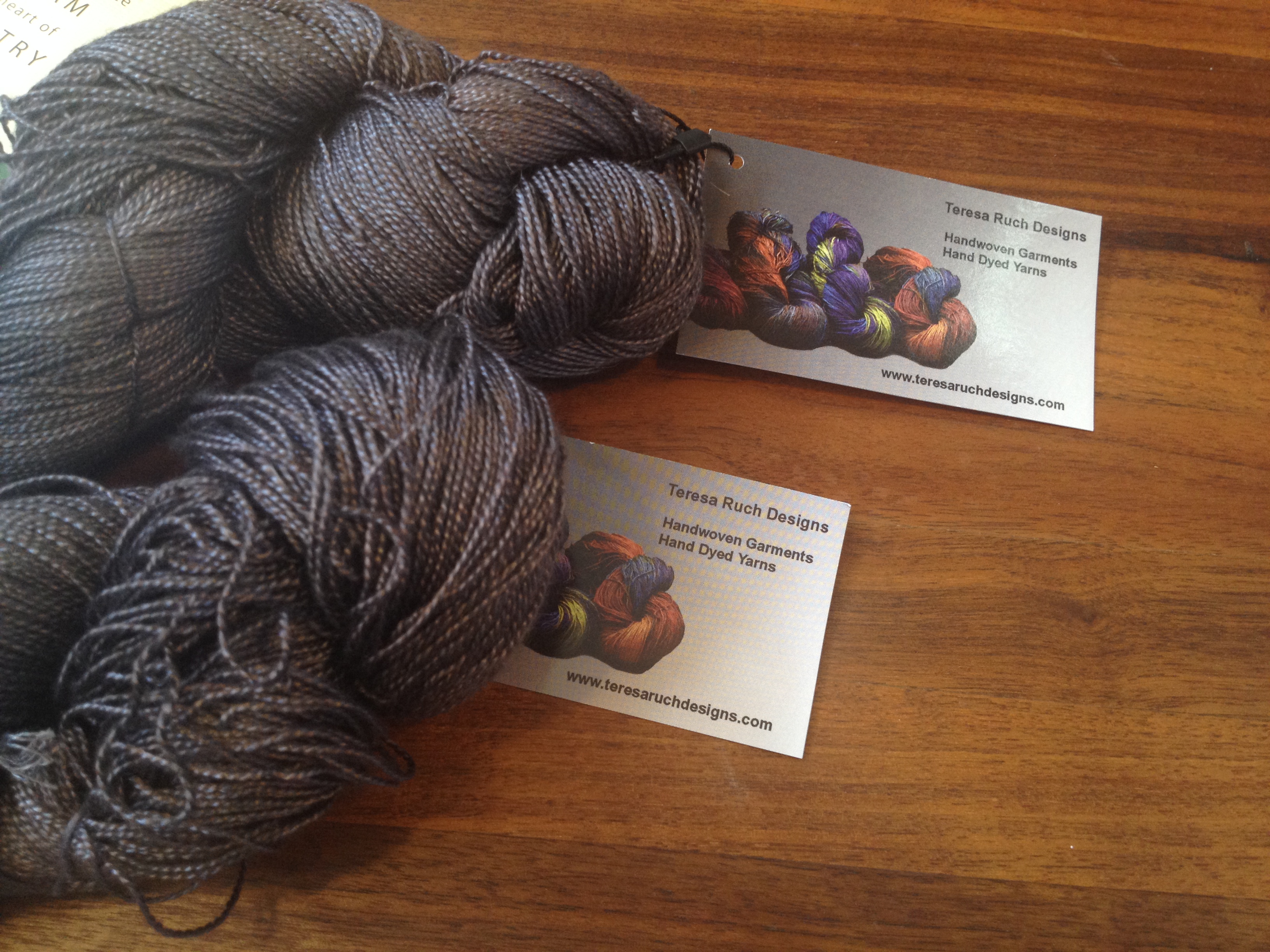 Secondly, after touring the entire fairgrounds once, and doubling back again, I found myself back at the booth of Teresa Ruch and her amazing hand-dyed tencel heavy lace weight yarn. It’s this amazing dark-steel color, with a lovely sheen, and I can’t wait to try some actual lace knitting, perhaps a small stole or capelet. I’m eager to do a little sleuthing on Ravelry to see what kind of patterns I can find to adapt to this beautiful stuff!